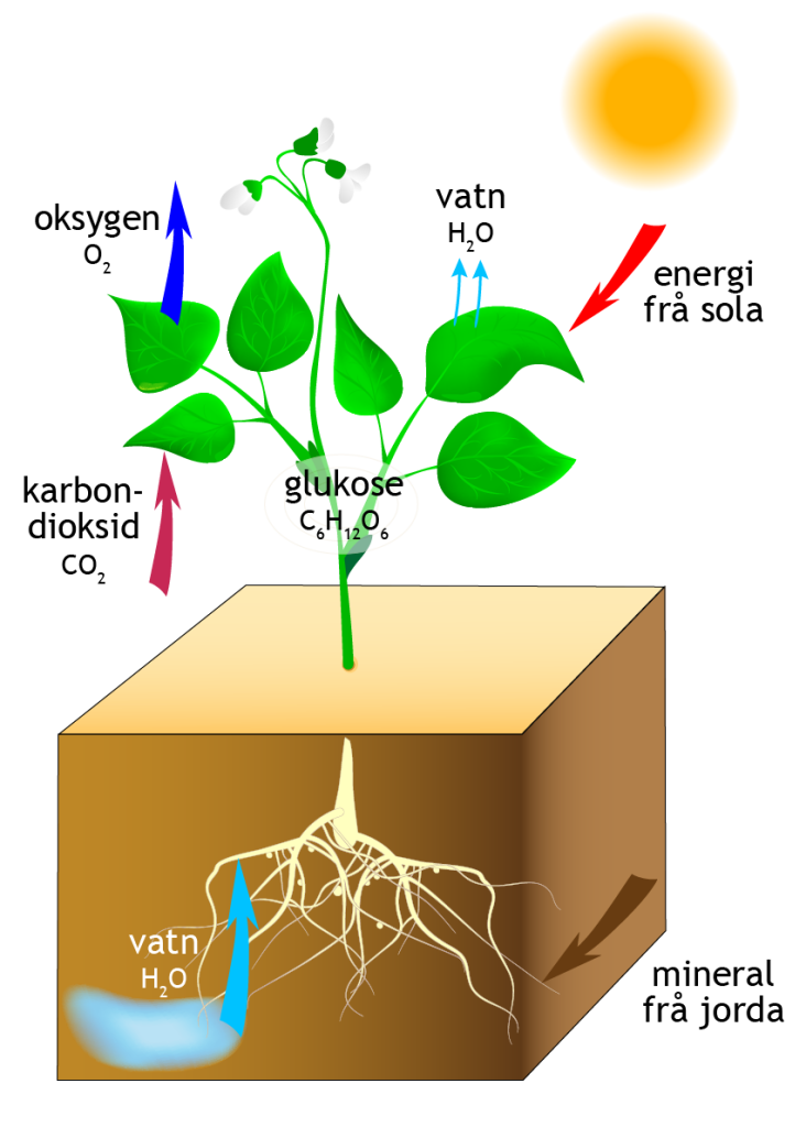 I fotosyntesen bruker plantene sollys til å gjera karbondioksid og vatn om til glukose (=energi) og oksygen.