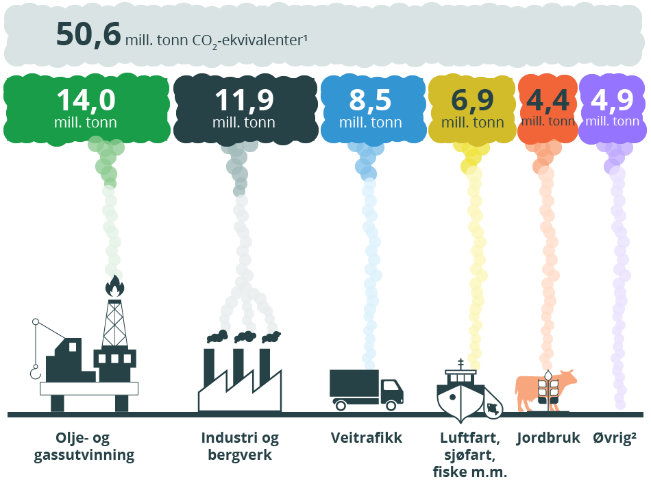 I 2019 kom 84 prosent av norske klimagassutslepp frå karbondioksid. I perioden 1990–2019 har norske utslepp av karbondioksid auka med 19 prosent.