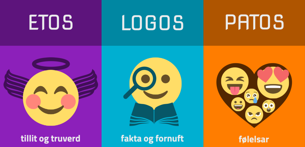 Dei retoriske appellformene – etos, logos og patos er viktige når me skal bruka retorikk eller analysera retorikken i tekstar og talar.